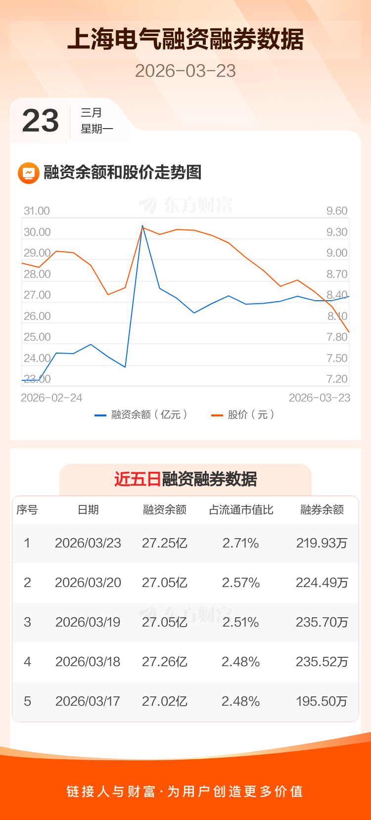 交易所最新数据显示,上海电气于2026年3月23日获融资买入1.78亿元,融资偿还1.58亿元,当日融资净买入2007.09万元。目前,该股融资余额27.25亿,占流通市值比例为2.71%。