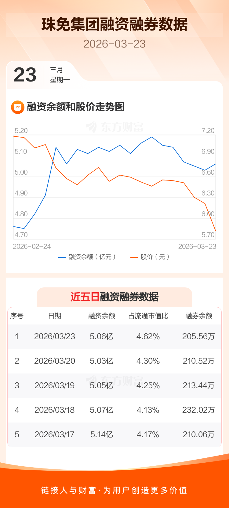 交易所最新数据显示,珠免集团于2026年3月23日获融资买入1957.17万元,融资偿还1629.13万元,当日融资净买入328.04万元。目前,该股融资余额5.06亿,占流通市值比例为4.62%。