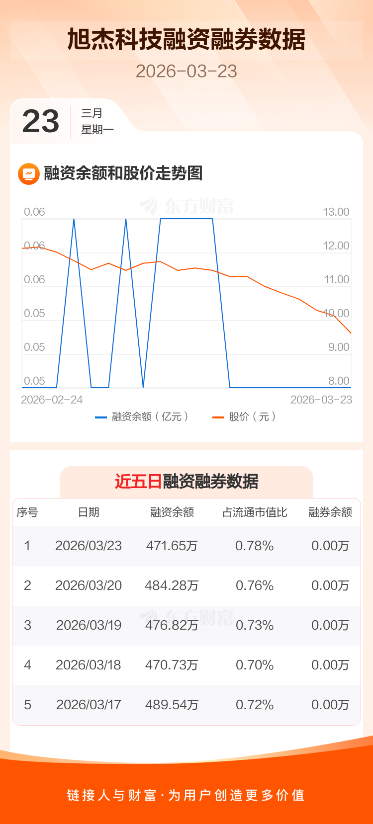 旭杰科技:融资净偿还12.62万元,融资余额471.65万元