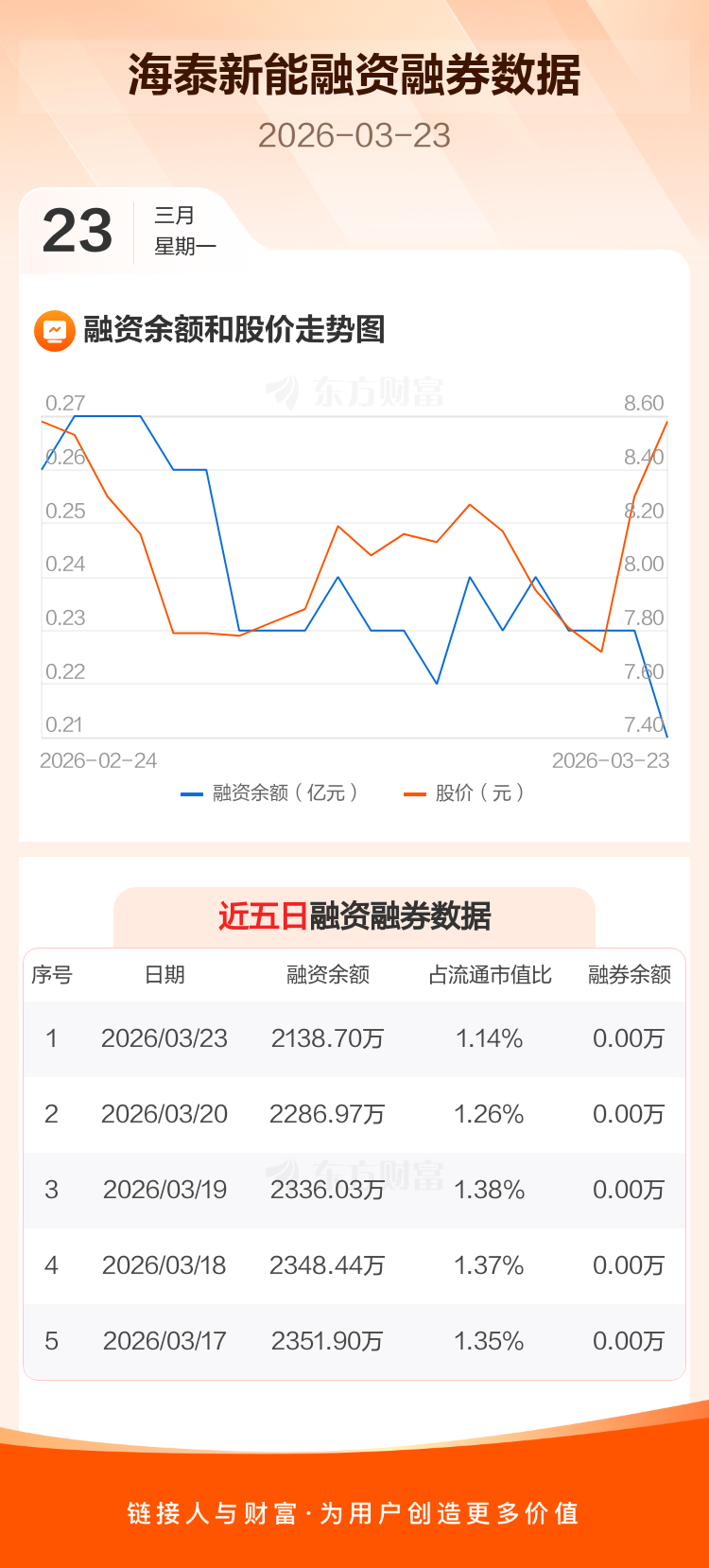 交易所最新数据显示,海泰新能于2026年3月23日获融资买入302.74万元,融资偿还451.01万元,当日融资净偿还148.27万元。目前,该股融资余额2138.70万,占流通市值比例为1.14%。