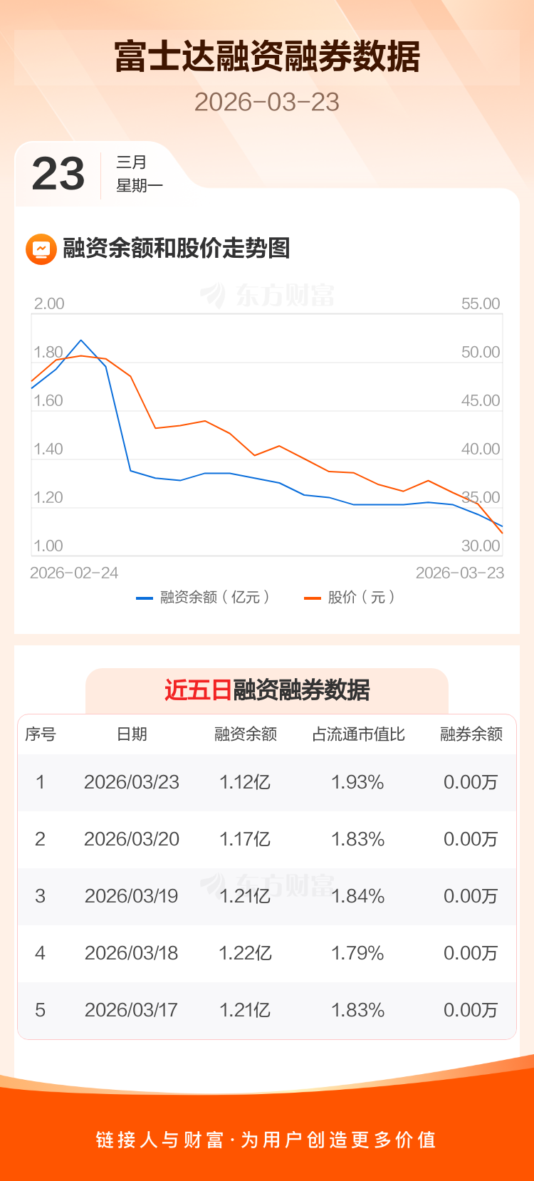 交易所最新数据显示,富士达于2026年3月23日获融资买入275.50万元,融资偿还710.37万元,当日融资净偿还434.87万元。目前,该股融资余额1.12亿,占流通市值比例为1.93%。
