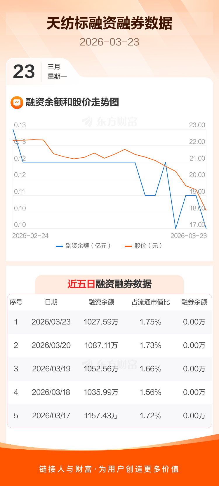 交易所最新数据显示,天纺标于2026年3月23日获融资买入67.31万元,融资偿还126.82万元,当日融资净偿还59.52万元。目前,该股融资余额1027.59万,占流通市值比例为1.75%。