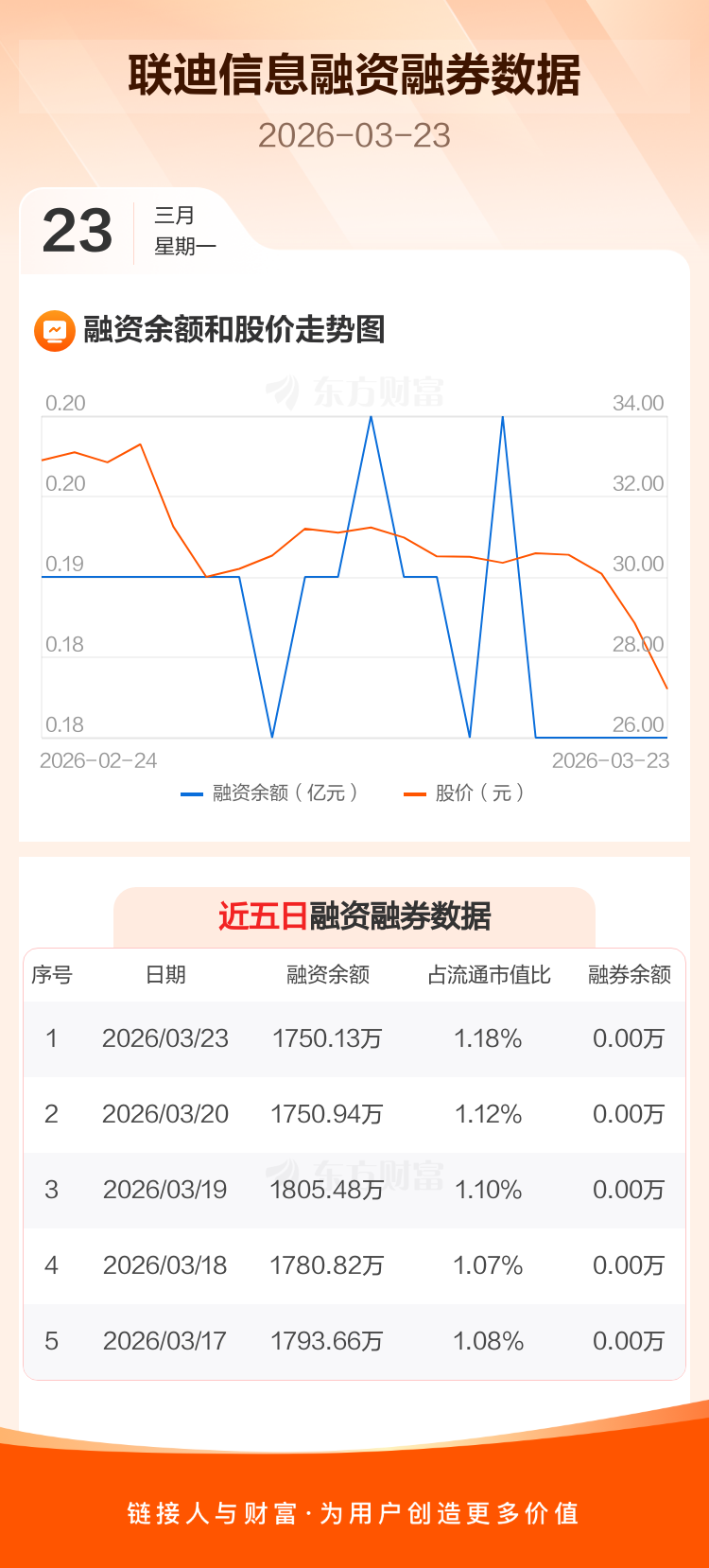 交易所最新数据显示,联迪信息于2026年3月23日获融资买入25.04万元,融资偿还25.85万元,当日融资净偿还8110元。目前,该股融资余额1750.13万,占流通市值比例为1.18%。