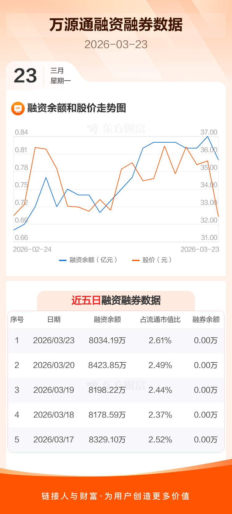 交易所最新数据显示,万源通于2026年3月23日获融资买入1006.81万元,融资偿还1396.46万元,当日融资净偿还389.65万元。目前,该股融资余额8034.19万,占流通市值比例为2.61%。