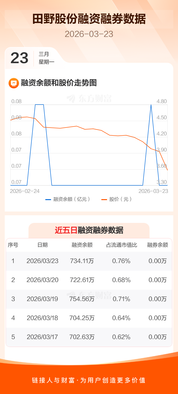 交易所最新数据显示,田野股份于2026年3月23日获融资买入13.12万元,融资偿还1.62万元,当日融资净买入11.5万元。目前,该股融资余额734.11万,占流通市值比例为0.76%。