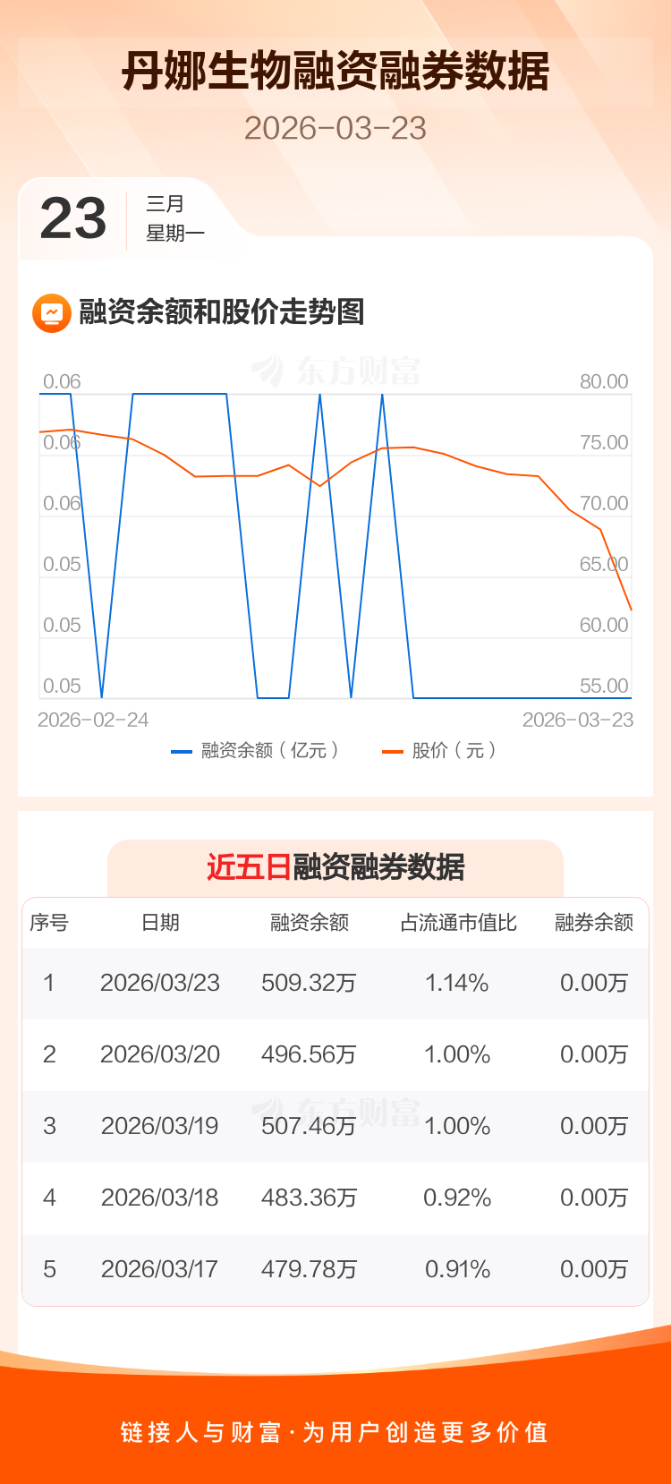 交易所最新数据显示,丹娜生物于2026年3月23日获融资买入35.94万元,融资偿还23.18万元,当日融资净买入12.76万元。目前,该股融资余额509.32万,占流通市值比例为1.14%。