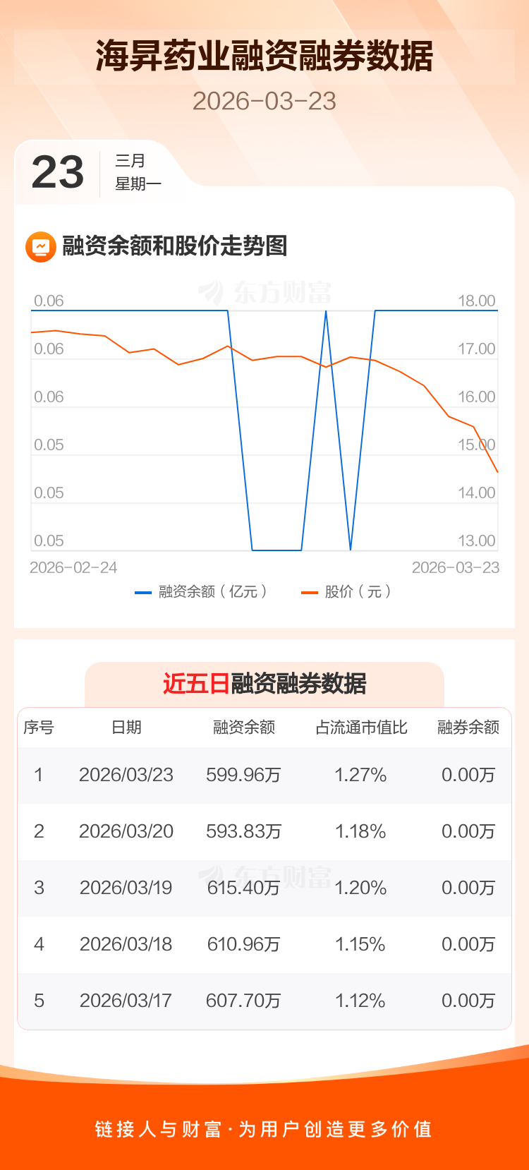 交易所最新数据显示,海昇药业于2026年3月23日获融资买入6.74万元,融资偿还6197元,当日融资净买入6.13万元。目前,该股融资余额599.96万,占流通市值比例为1.27%。