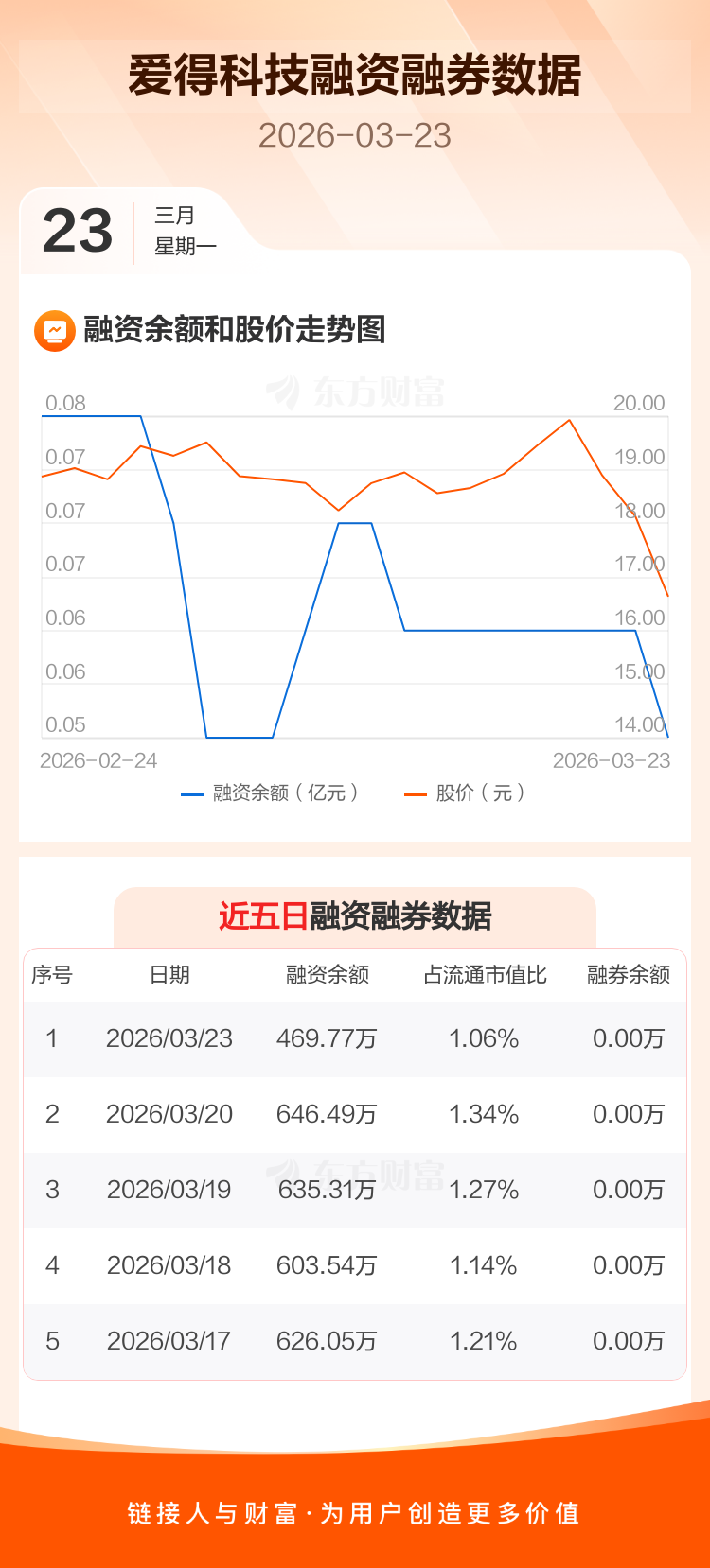 交易所最新数据显示,爱得科技于2026年3月23日获融资买入30.96万元,融资偿还207.67万元,当日融资净偿还176.72万元。目前,该股融资余额469.77万,占流通市值比例为1.06%。