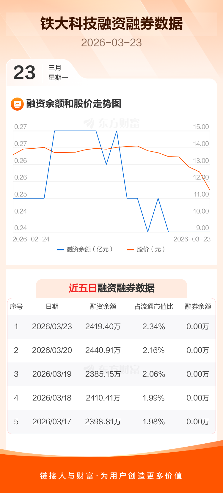 交易所最新数据显示,铁大科技于2026年3月23日获融资买入121.83万元,融资偿还143.33万元,当日融资净偿还21.51万元。目前,该股融资余额2419.40万,占流通市值比例为2.34%。