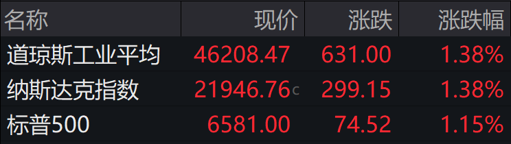 当地时间周一,美股结束三连阴,三大指数均涨超1%。截至收盘,道指大涨631点,涨幅1.38%,纳指涨1.38%,标普500指数涨1.15%。