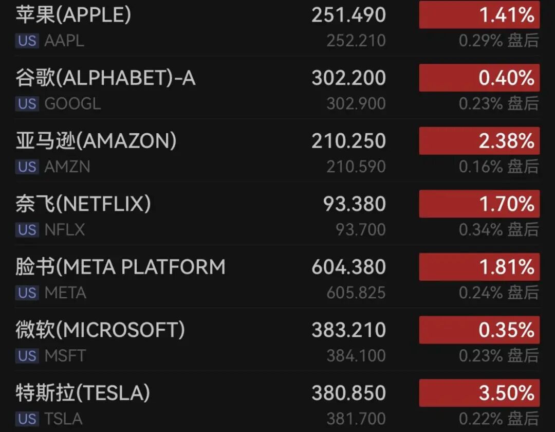 大型科技股集体上涨,特斯拉涨超3%,亚马逊涨逾2%,脸书涨近2%,英伟达、苹果涨超1%,谷歌涨0.4%,微软涨0.35%。