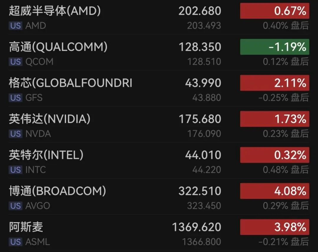 芯片股多数上涨,费城半导体指数涨1.34%,博通涨超4%,阿斯麦涨近4%,ARM涨超3%,台积电涨逾2%,美光科技跌超4%,高通跌逾1%。