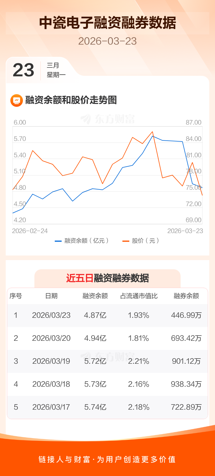 交易所最新数据显示,中瓷电子于2026年3月23日获融资买入8603.81万元,融资偿还9308.72万元,当日融资净偿还704.91万元。目前,该股融资余额4.87亿,占流通市值比例为1.93%。