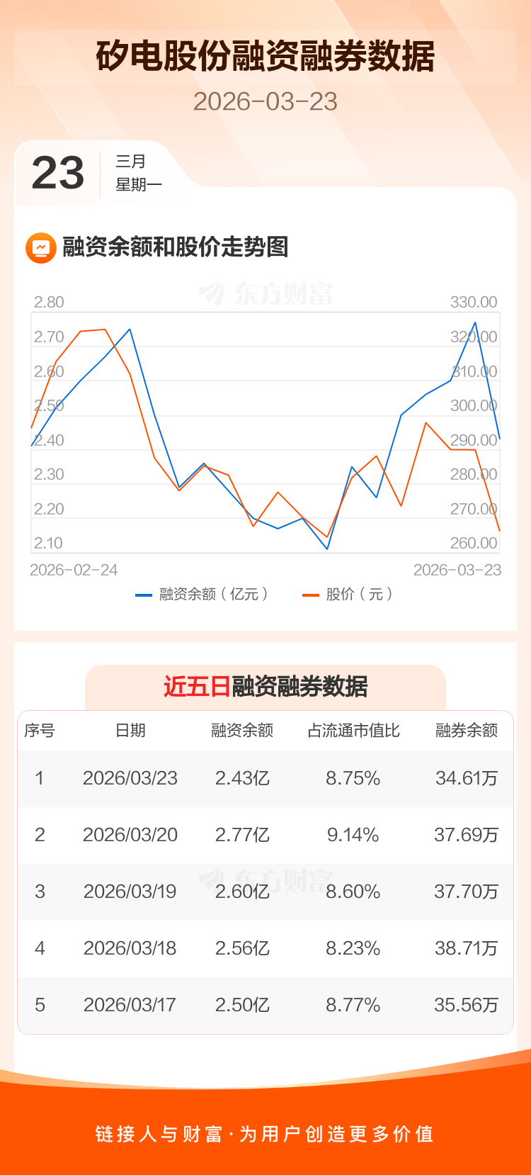 交易所最新数据显示,矽电股份于2026年3月23日获融资买入3595.02万元,融资偿还6940.30万元,当日融资净偿还3345.29万元。目前,该股融资余额2.43亿,占流通市值比例为8.75%。