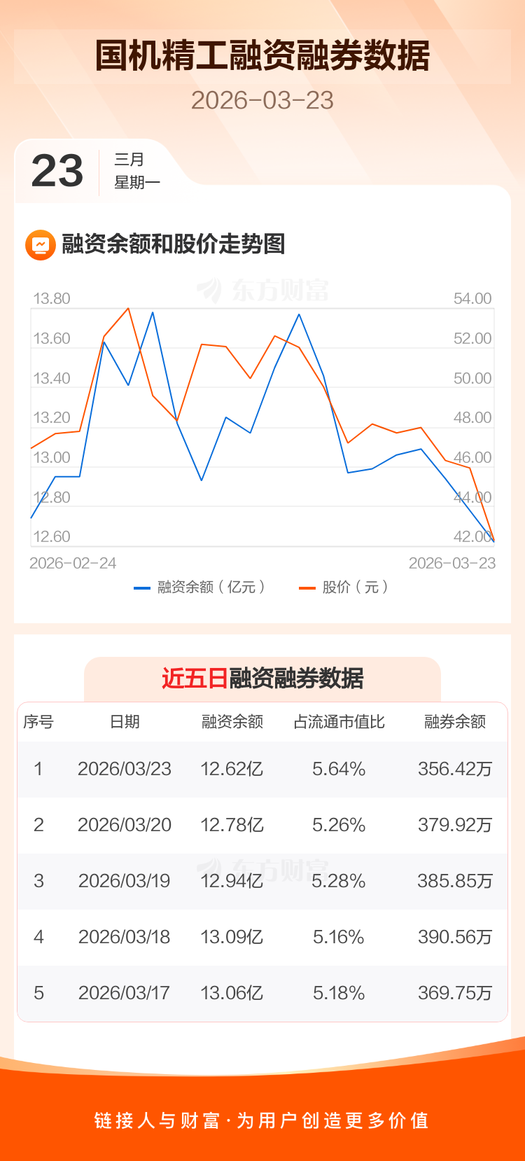 交易所最新数据显示,国机精工于2026年3月23日获融资买入7531.01万元,融资偿还9108.04万元,当日融资净偿还1577.03万元。目前,该股融资余额12.62亿,占流通市值比例为5.64%。