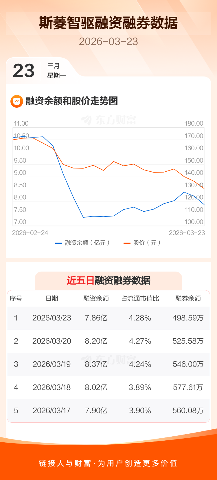 交易所最新数据显示,斯菱智驱于2026年3月23日获融资买入3028.21万元,融资偿还6403.37万元,当日融资净偿还3375.16万元。目前,该股融资余额7.86亿,占流通市值比例为4.28%。