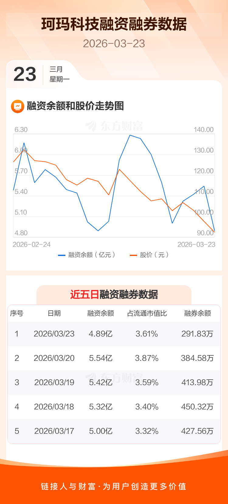 交易所最新数据显示,珂玛科技于2026年3月23日获融资买入5622.83万元,融资偿还1.21亿元,当日融资净偿还6498.3万元。目前,该股融资余额4.89亿,占流通市值比例为3.61%。