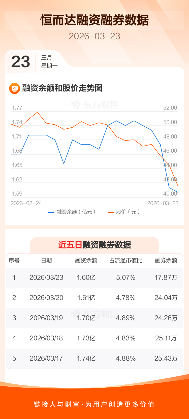 交易所最新数据显示,恒而达于2026年3月23日获融资买入354.29万元,融资偿还522.80万元,当日融资净偿还168.52万元。目前,该股融资余额1.60亿,占流通市值比例为5.07%。