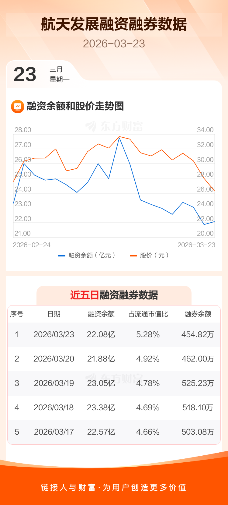交易所最新数据显示,航天发展于2026年3月23日获融资买入2.72亿元,融资偿还2.53亿元,当日融资净买入1924.05万元。目前,该股融资余额22.08亿,占流通市值比例为5.28%。