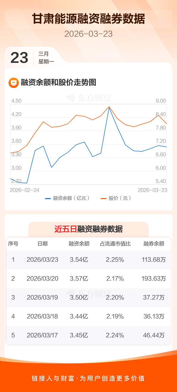 交易所最新数据显示,甘肃能源于2026年3月23日获融资买入7296.59万元,融资偿还7586.75万元,当日融资净偿还290.16万元。目前,该股融资余额3.54亿,占流通市值比例为2.25%。