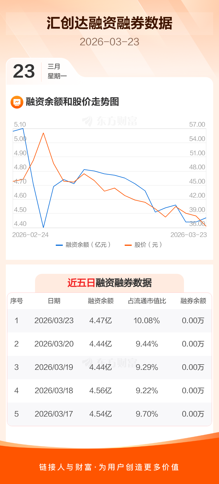 交易所最新数据显示,汇创达于2026年3月23日获融资买入1694.00万元,融资偿还1391.26万元,当日融资净买入302.74万元。目前,该股融资余额4.47亿,占流通市值比例为10.08%。