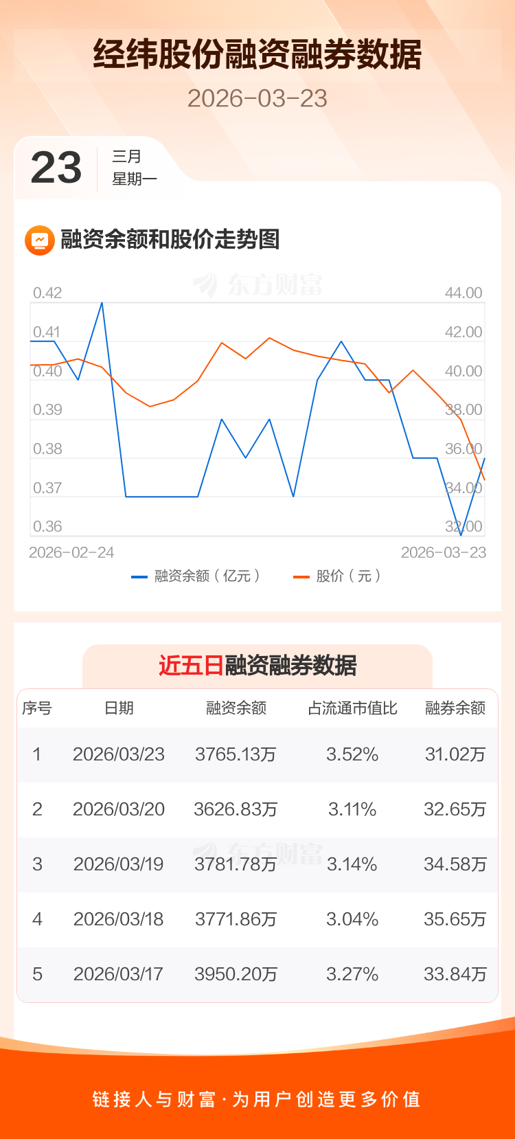 交易所最新数据显示,经纬股份于2026年3月23日获融资买入742.72万元,融资偿还604.42万元,当日融资净买入138.3万元。目前,该股融资余额3765.13万,占流通市值比例为3.52%。