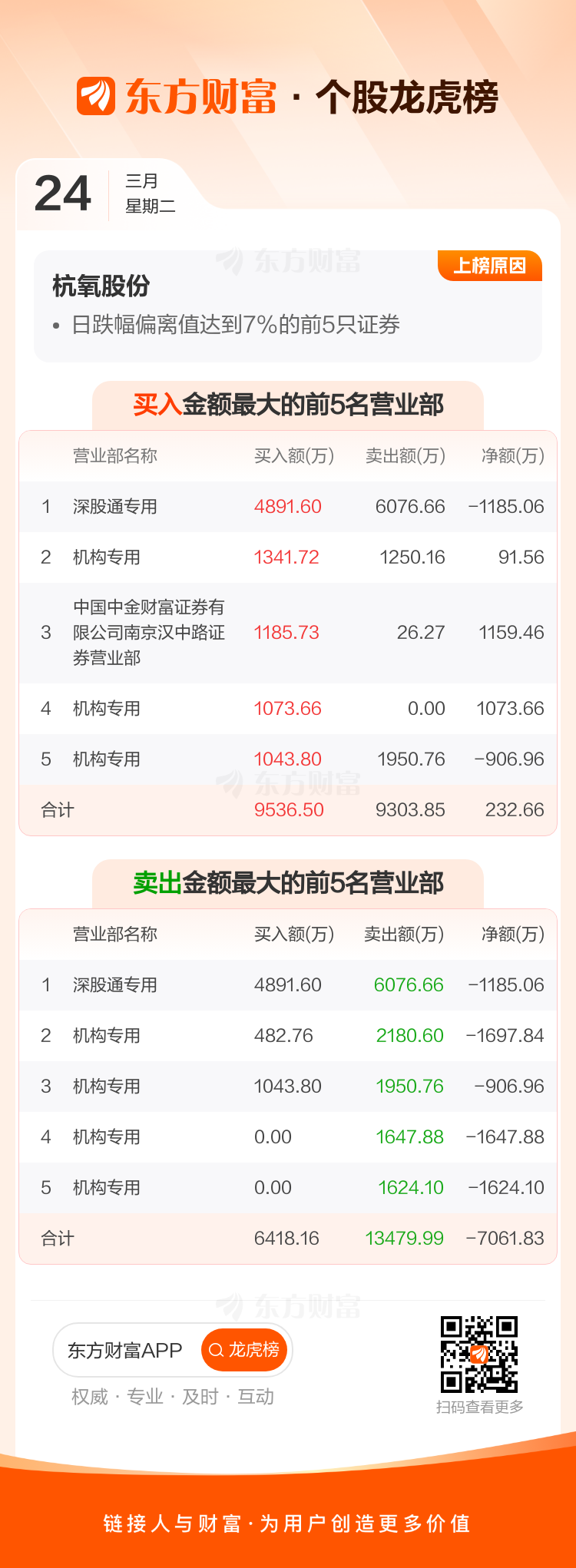 交易所2026年3月24日公布的交易公开信息显示,杭氧股份因成为日跌幅偏离值达到7%的前5只证券上榜。杭氧股份当日收报27.76元,涨跌幅-5.19%,偏离值-7.36%,换手率2.61%,成交额7.07亿。