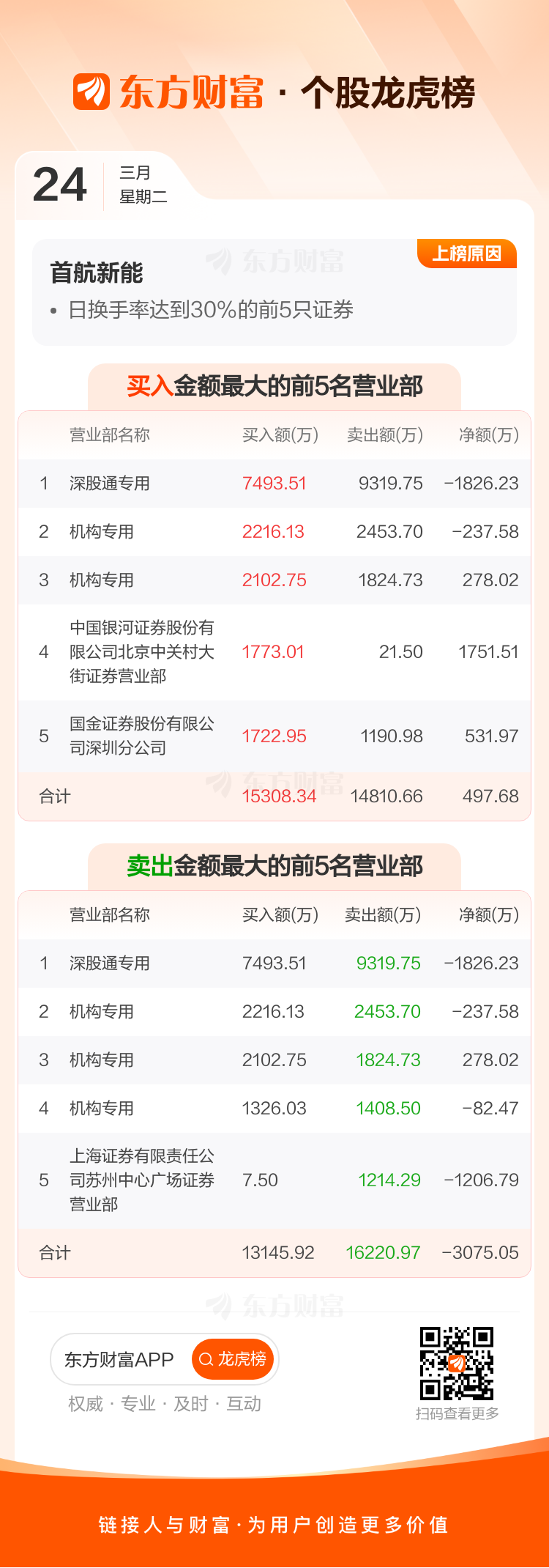 交易所2026年3月24日公布的交易公开信息显示,首航新能因成为日换手率达到30%的前5只证券上榜。首航新能当日收报59.88元,涨跌幅-1.53%,偏离值50.24%,换手率50.24%,成交额12.45亿。