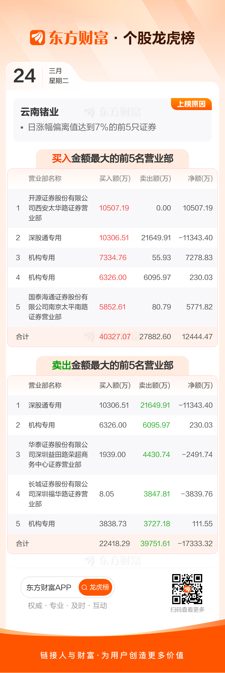 交易所2026年3月24日公布的交易公开信息显示,云南锗业因成为日涨幅偏离值达到7%的前5只证券上榜。云南锗业当日收报44.66元,涨跌幅10.00%,偏离值7.83%,换手率12.82%,成交额36.02亿。