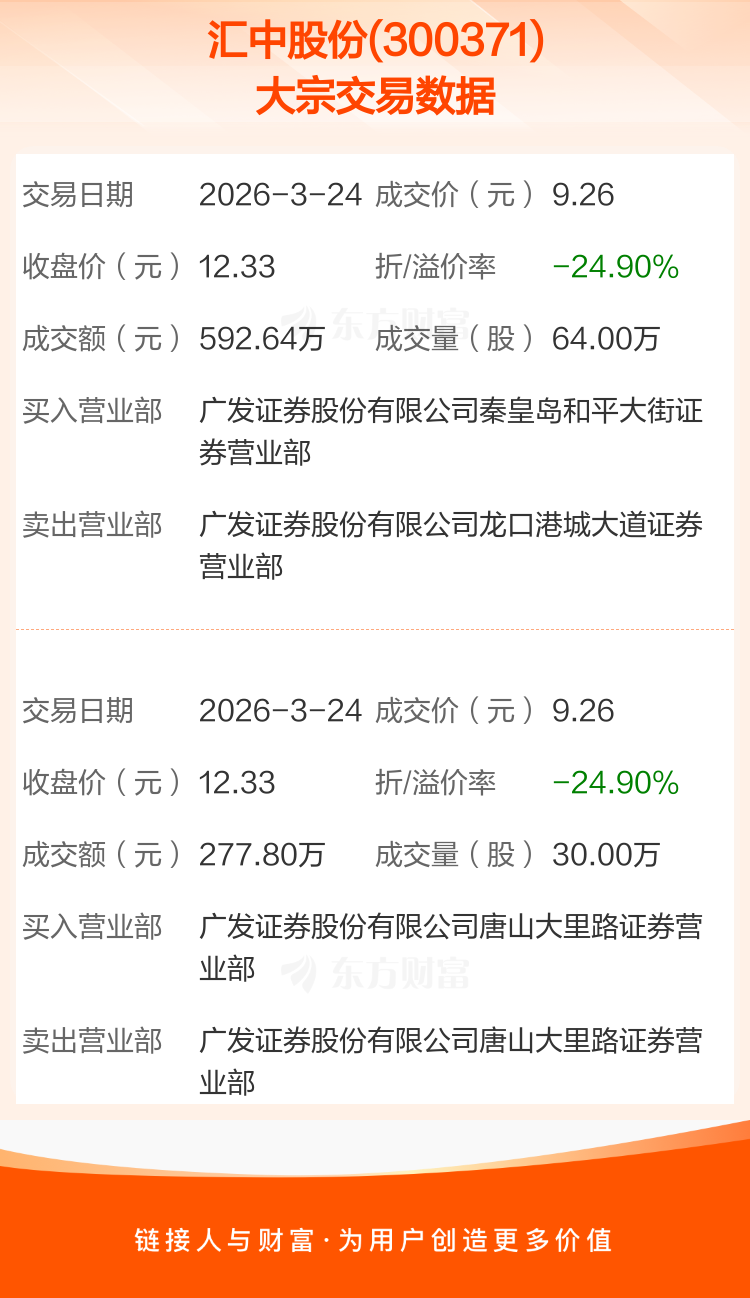 2026年3月24日,汇中股份发生2笔大宗交易,共成交94.00万股,成交金额870.44万元,占其流通市值比例为0.53%。
