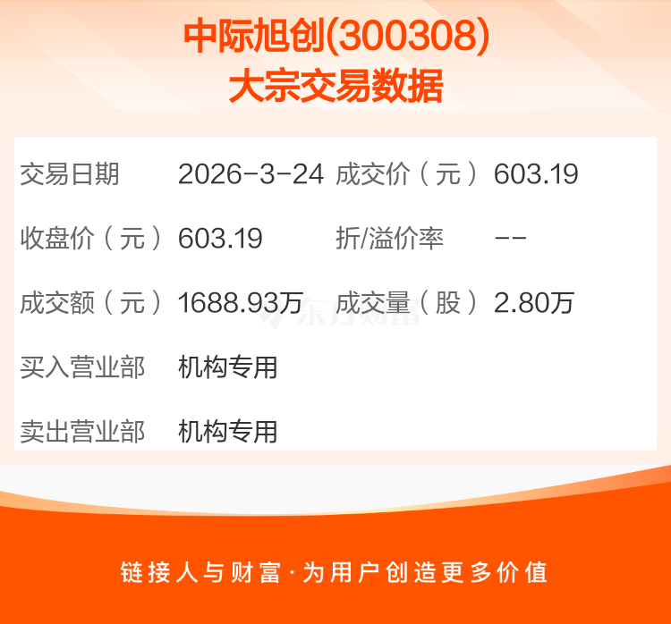 大宗交易:中际旭创成交1688.93万元(3-24)