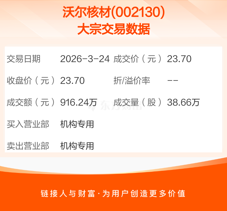 2026年3月24日,沃尔核材发生1笔大宗交易,共成交38.66万股,成交金额916.24万元,占其流通市值比例为0.03%。