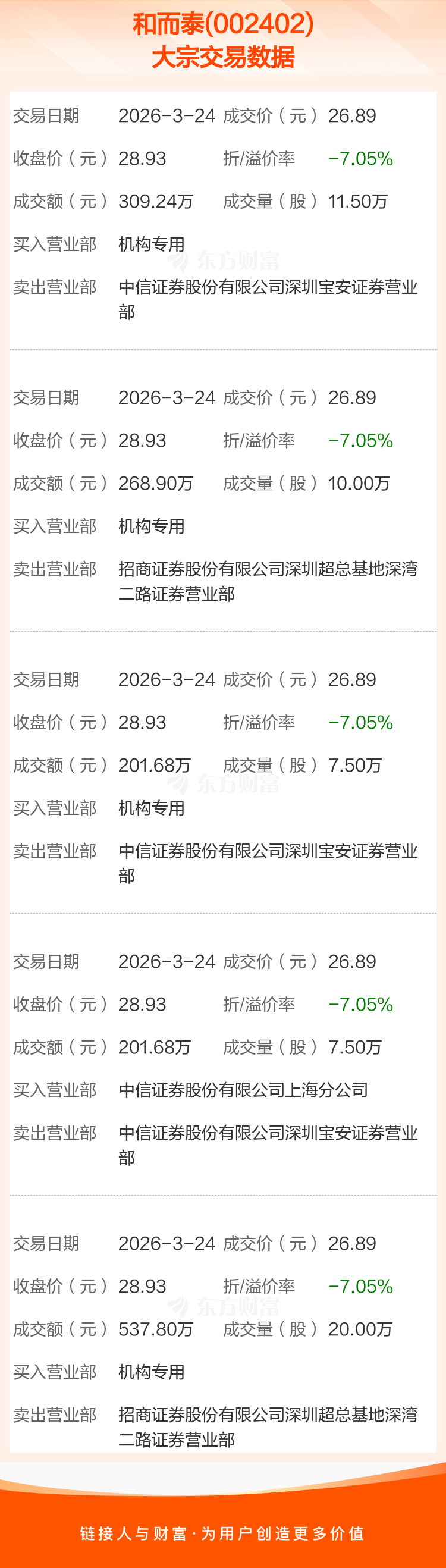 2026年3月24日,和而泰发生5笔大宗交易,共成交56.50万股,成交金额1519.30万元,占其流通市值比例为0.06%。