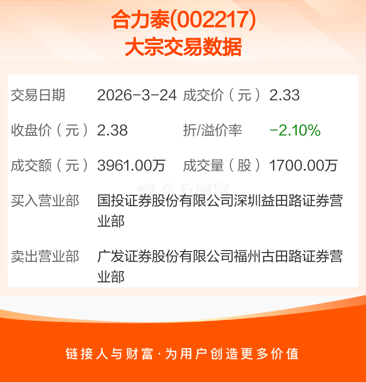 2026年3月24日,合力泰发生1笔大宗交易,共成交1700.00万股,成交金额3961.00万元,占其流通市值比例为0.23%。
