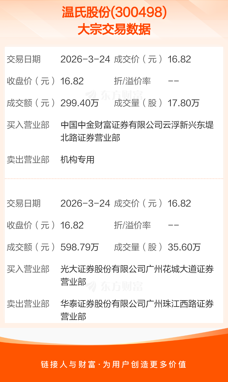 2026年3月24日,温氏股份发生2笔大宗交易,共成交53.40万股,成交金额898.19万元。