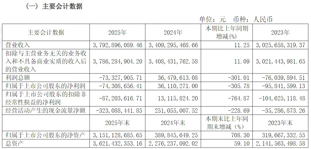 宏达股份年报显示,公司2025年实现营业收入37.93亿元,同比增长11.25%;实现归母净利润为亏损7430.87万元,同比下降305.78%;实现扣非归母净利润为亏损8720.36万元,同比下降764.87%;基本每股收益-0.03元。
