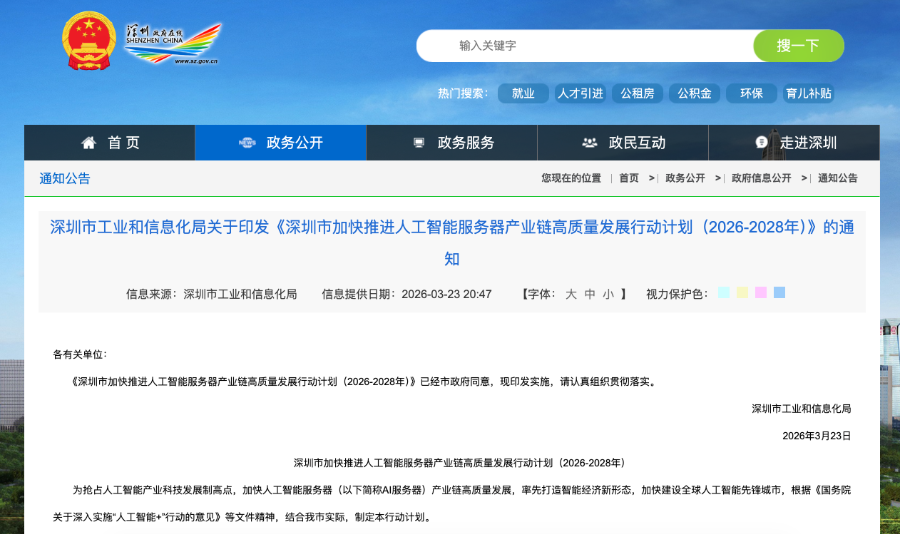 3月23日,深圳市工业和信息化局正式印发《深圳市加快推进人工智能服务器产业链高质量发展行动计划(2026-2028年)》(以下简称《行动计划》)。