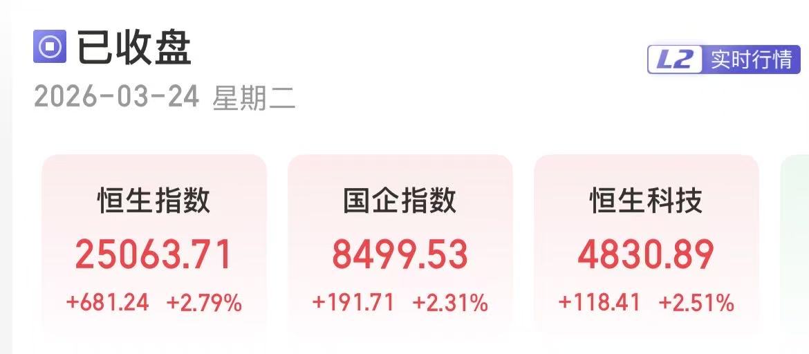 上证报中国证券网讯3月24日,港股三大指数迎来反弹。截至收盘,恒生指数涨2.79%,报25063.71点;恒生国企指数涨2.31%,报8499.53点;恒生科技指数涨2.51%,报4830.89点。