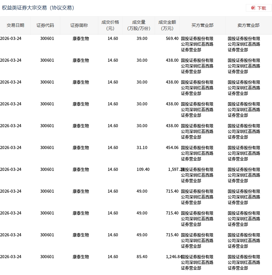 康泰生物今日大宗交易溢价成交531.9万股,成交额7765.74万元