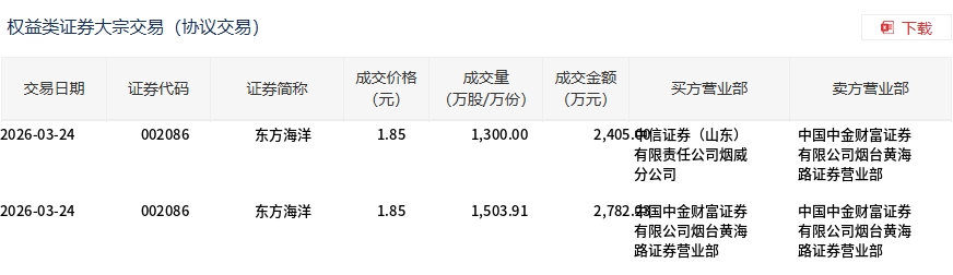 东方海洋今日大宗交易折价成交2803.91万股,成交额5187.23万元