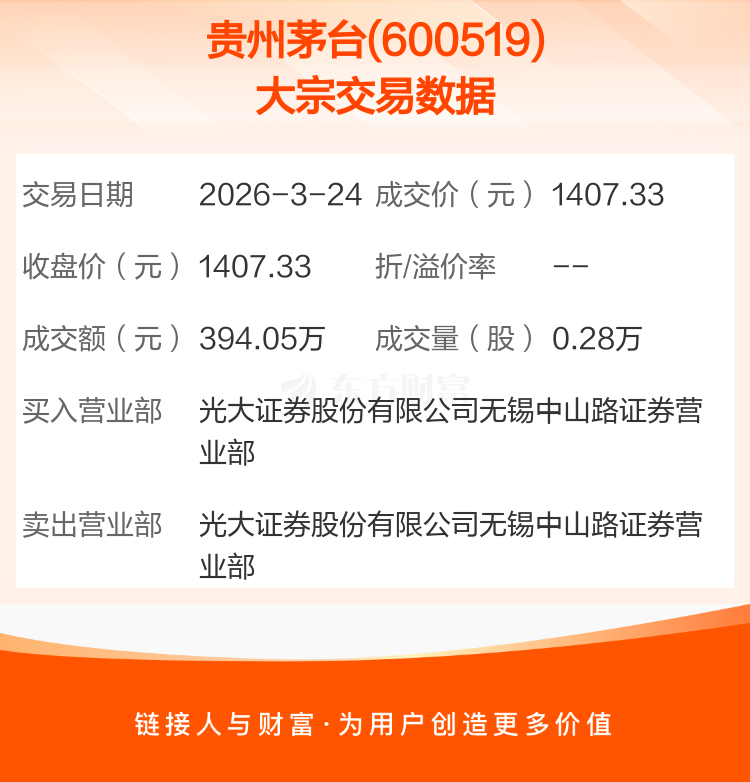 2026年3月24日,贵州茅台发生1笔大宗交易,共成交2800股,成交金额394.05万元。