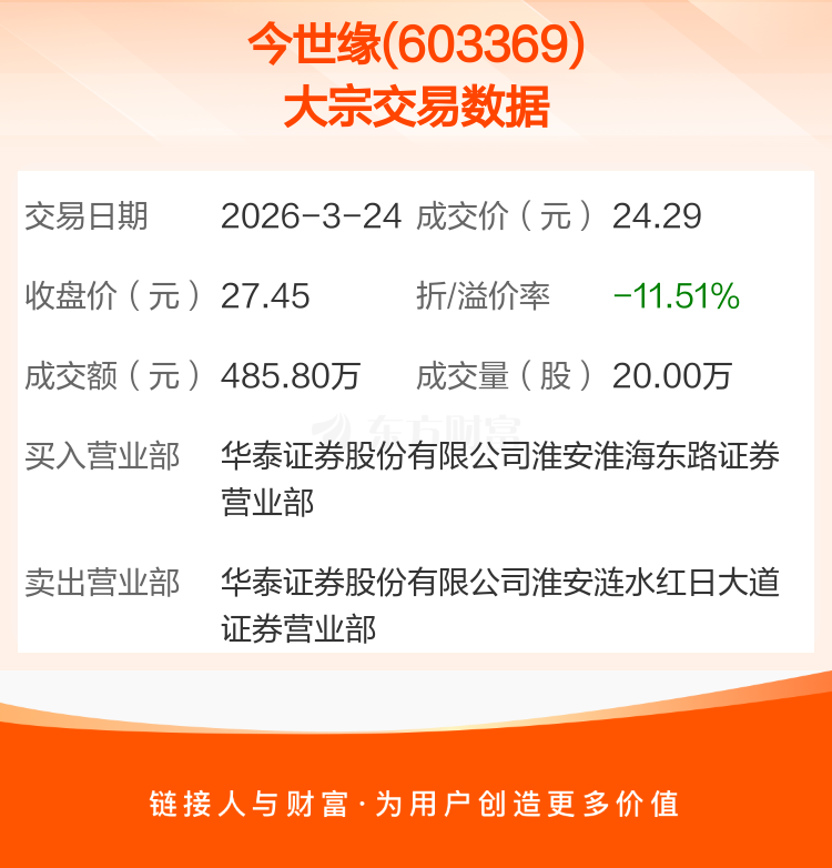 2026年3月24日,今世缘发生1笔大宗交易,共成交20.00万股,成交金额485.80万元,占其流通市值比例为0.01%。