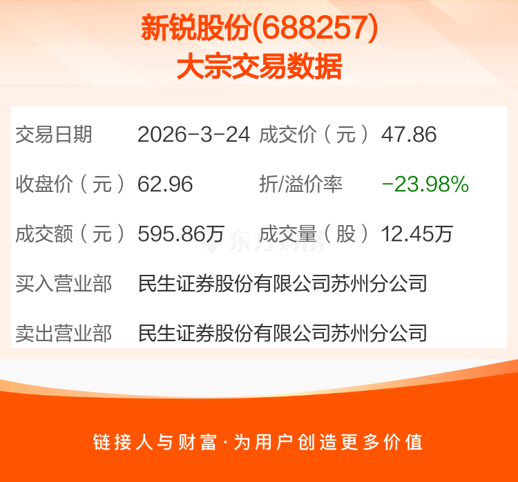 2026年3月24日,新锐股份发生1笔大宗交易,共成交12.45万股,成交金额595.86万元,占其流通市值比例为0.04%。