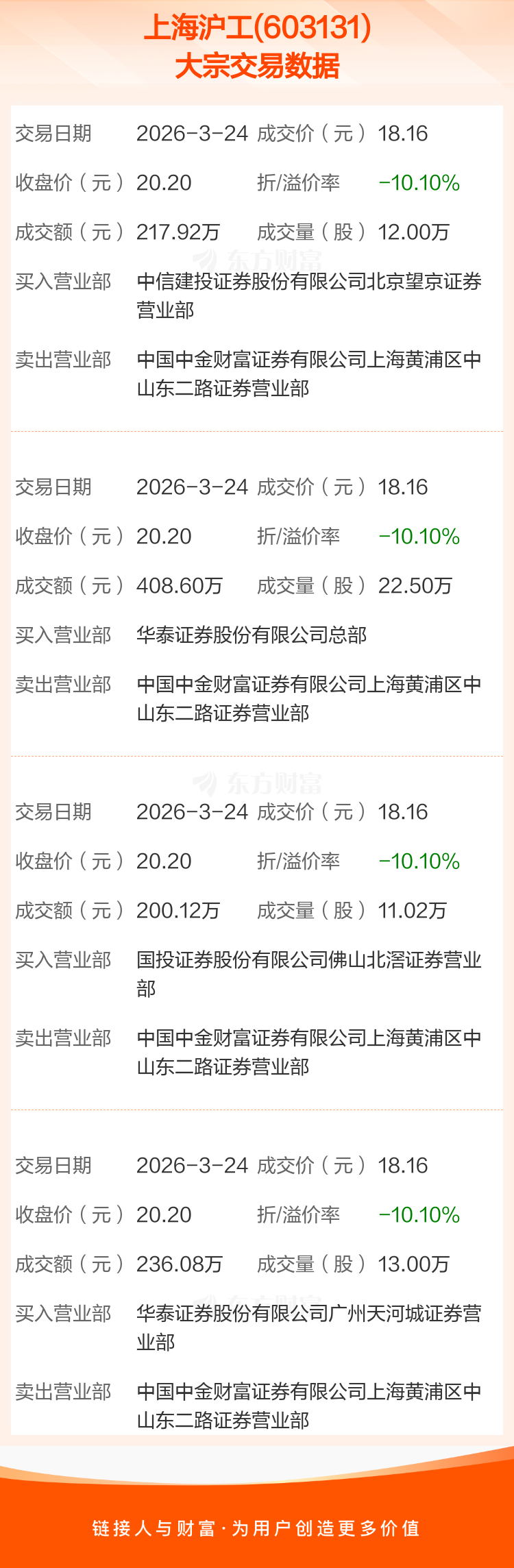 2026年3月24日,上海沪工发生4笔大宗交易,共成交58.52万股,成交金额1062.72万元,占其流通市值比例为0.16%。