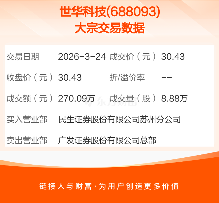 2026年3月24日,世华科技发生1笔大宗交易,共成交8.88万股,成交金额270.09万元,占其流通市值比例为0.03%。