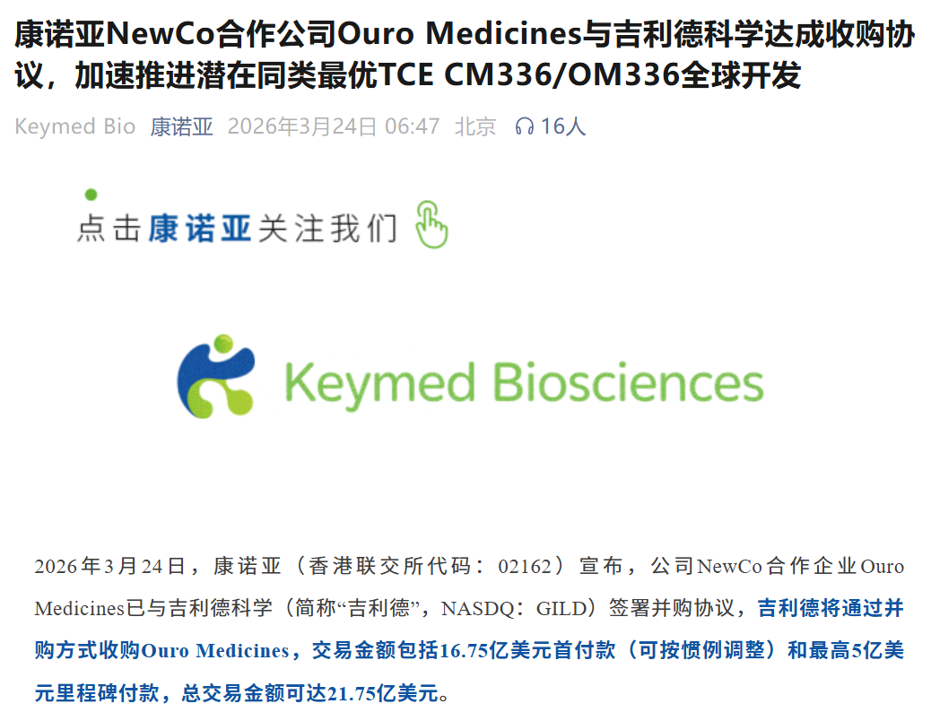 3月24日,康诺亚(02162.HK)发布公告称,公司NewCo合作企业Ouro Medicines已与吉利德科学(简称“吉利德”,NASDQ:GILD)签署并购协议,吉利德将以并购方式收购Ouro Medicines。此次交易总金额可达21.75亿美元,包括16.75亿美元首付款(可按惯例调整)和最高5亿美元里程碑付款。