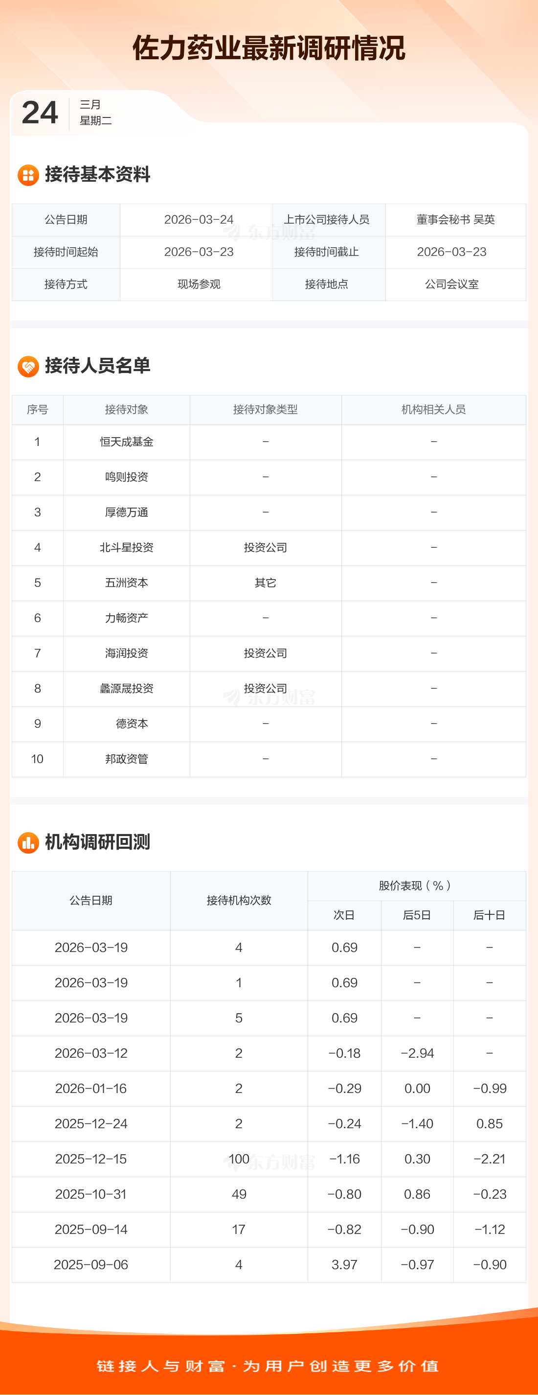 佐力药业3月24日公告称,3月23日接待恒天成基金等10家机构调研。接待人员包括董事会秘书 吴英。