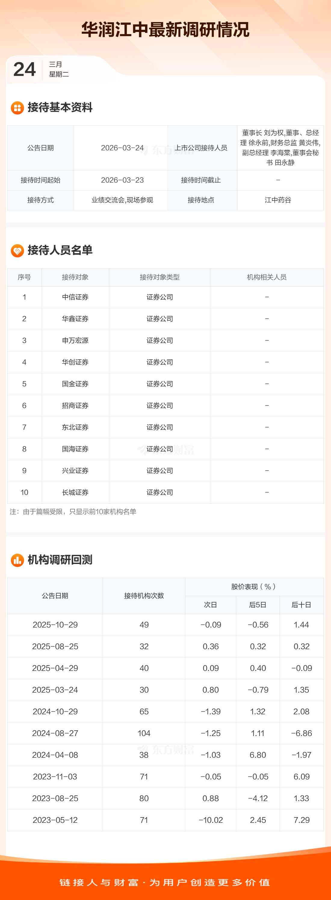 华润江中3月24日公告称,3月23日接待中信证券等45家机构调研。接待人员包括董事长 刘为权,董事、总经理 徐永前,财务总监 黄炎伟,副总经理 李海棠,董事会秘书 田永静。