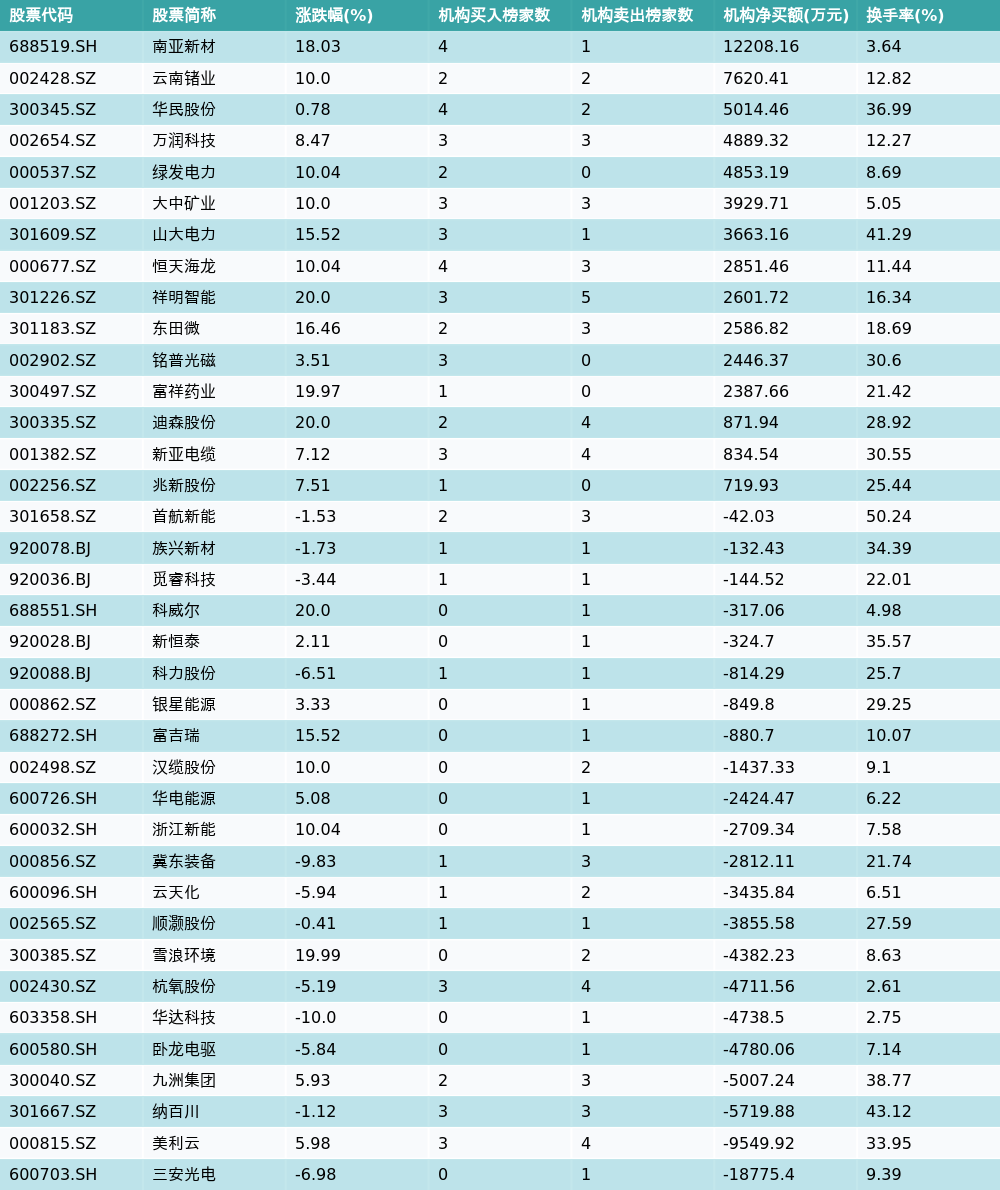 南财智讯3月24日电,盘后数据显示,因当日异动登上龙虎榜的个股中,37只沪深A股龙虎榜出现了机构的身影,机构合计净卖出20366.14万元,具体来看,机构净买入15只个股,净卖出22只个股。其中,机构净买入前三分别为南亚新材(688519.SH)、云南锗业(002428.SZ)与华民股份(300345.SZ),详情见下图:机构净卖出的个股中,前三分别为三安光电(600703.SH)、美利云(000815.SZ)与纳百川(301667.SZ)。