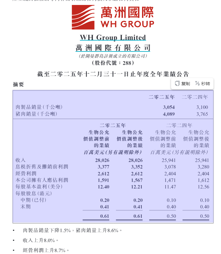 万洲国际2025年业绩公布!收入超280亿美元